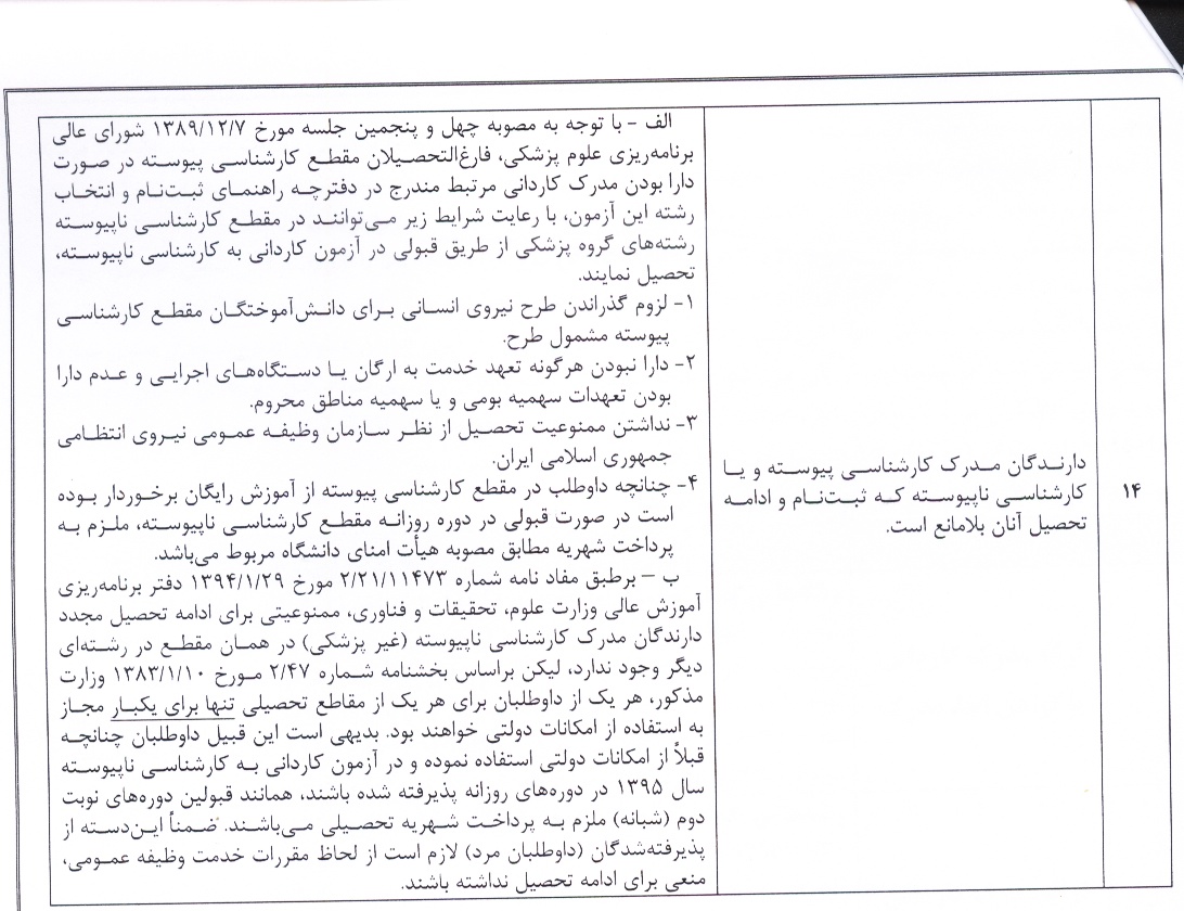 6- قبولی آن دسته از پذیرفته شدگان یک رشته - محل که تعداد آتها کمتر از 15 نفر است ، کم لن یکن تلقی می شود و ثبت نام آنها در پردیس ها ، ممنوع است . همین حکم به همه رشته هایی که پس از ثبت نام به حد نصاب مقرر نرسند ، حاکم است . در صورتیکه این دسته از پذیرفته شدگان تمایل به ادامه تحصیل داشته باشند ، می بایست به واحدهایی که آمار پذیرفته شده آنها بالای 15 نفر است ، جهت ثبت نام و ادامه تحصیل مراجعه نمایند .