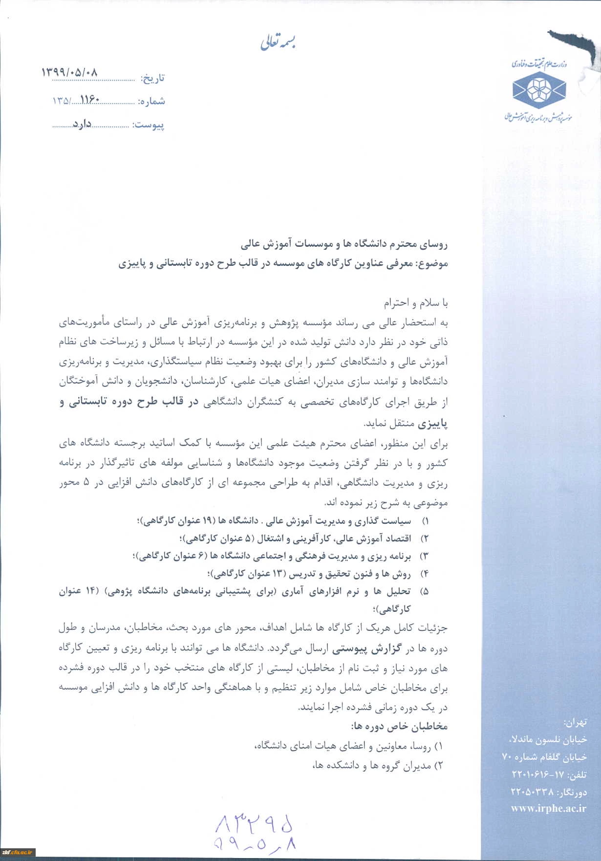 اصلاحیه عناوین کارگاههای موسسه پژوهش و برنامه ریزی آموزش عالی در قالب طرح دوره تابستانی و پاییزی 2