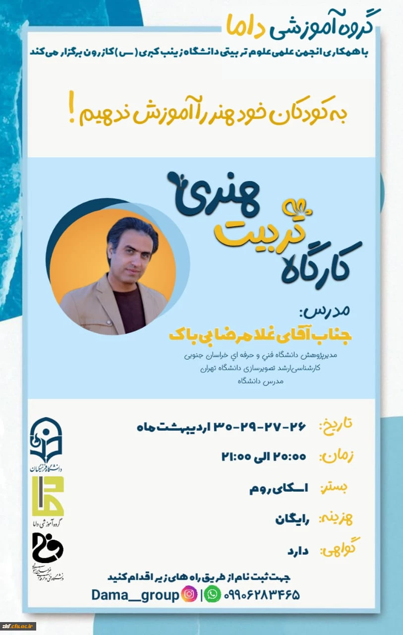 گروه آموزشی داما با همکاری انجمن علمی مرکز زینب کبری(س)کازرون برگزار می کند. کارگاه تربیت هنری 2
