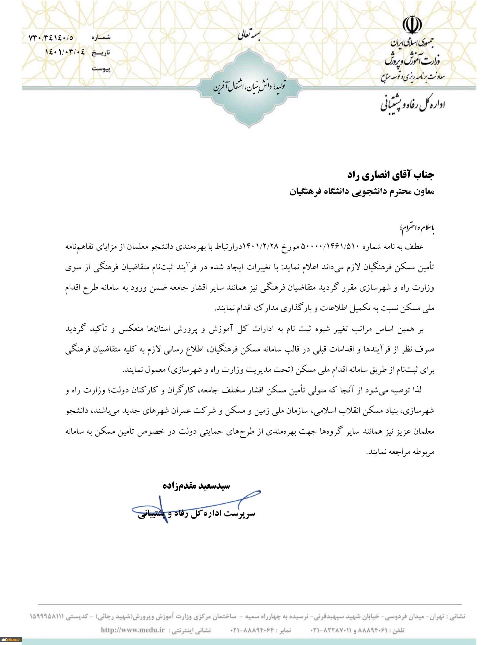 پاسخ اداره کل رفاه و پشتیبانی وزارت آموزش و پرورش در ثبت طرح ملی مشکن فرهنگیان 2