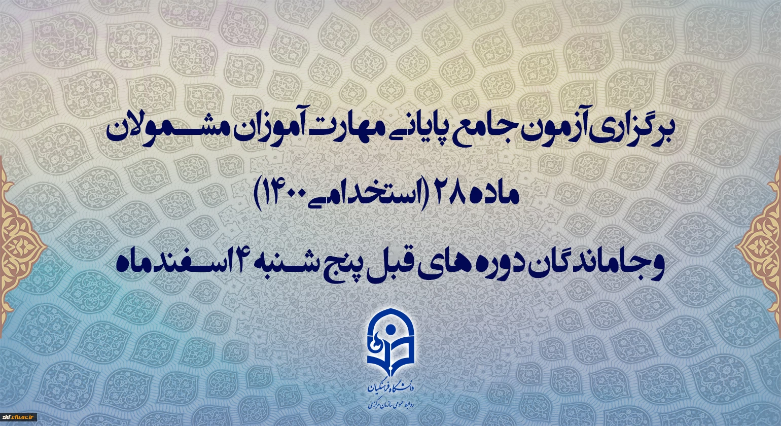 برگزاری آزمون جامع پایانی مهارت آموزان مشمولان ماده 28 (استخدامی1400) و جاماندگان دوره های قبل پنج شنبه 4 اسفندماه 2