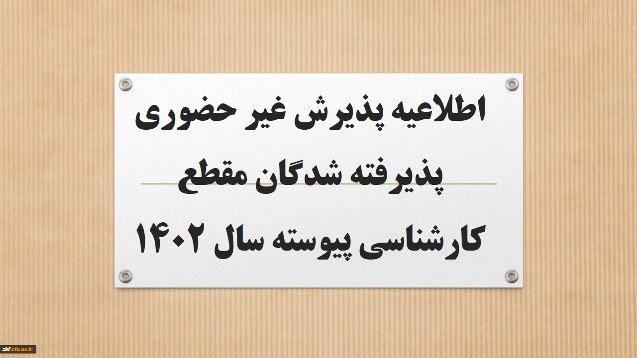 امتیاز دهید : اطلاعیه پذیرش غیر حضوری پذیرفته شدگان مقطع کارشناسی پیوسته سال 1402 2 یکشنبه 23 مهر 1402 ساعت 13:35