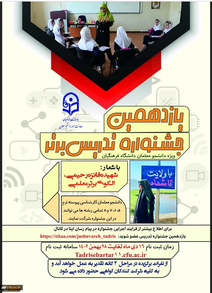 معاونت امور دانشجومعلمان برگزار می کند: یازدهمین جشنواره تخصصی تدریس برتر، ویژه دانشجو معلمان دانشگاه فرهنگیان 2