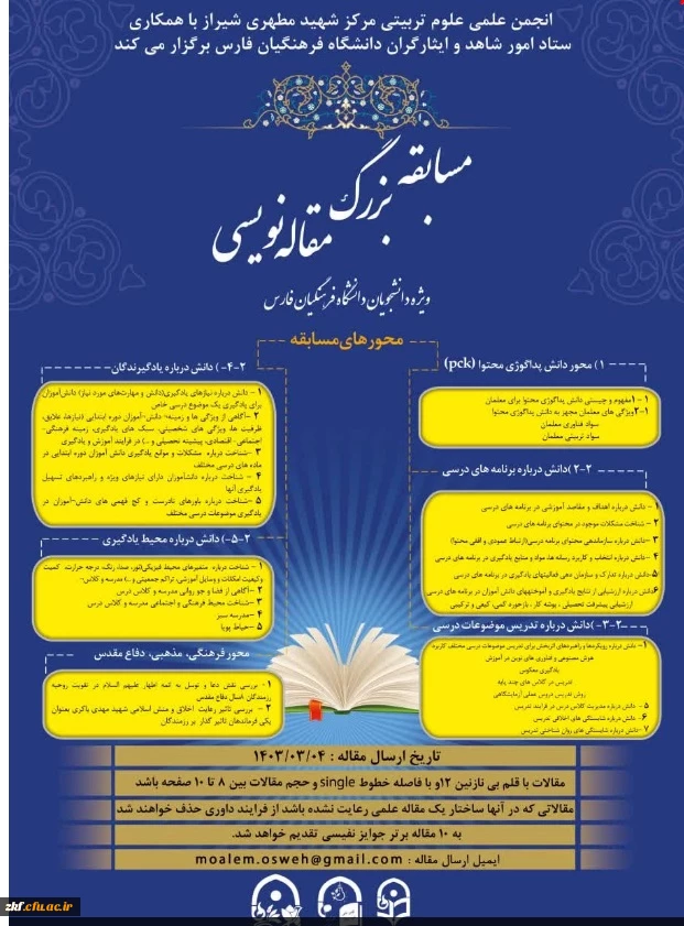 امتیاز دهید : مسابقه بزرگ مقاله نویسی ویژه دانشجویان دانشگاه فرهنگیان فارس 2 یکشنبه 23 اردیبهشت 1403 ساعت 14:55